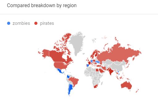 Below is a chart comparing the popularity of the terms “zombies” (in blue) vs. “pirates” (in red).